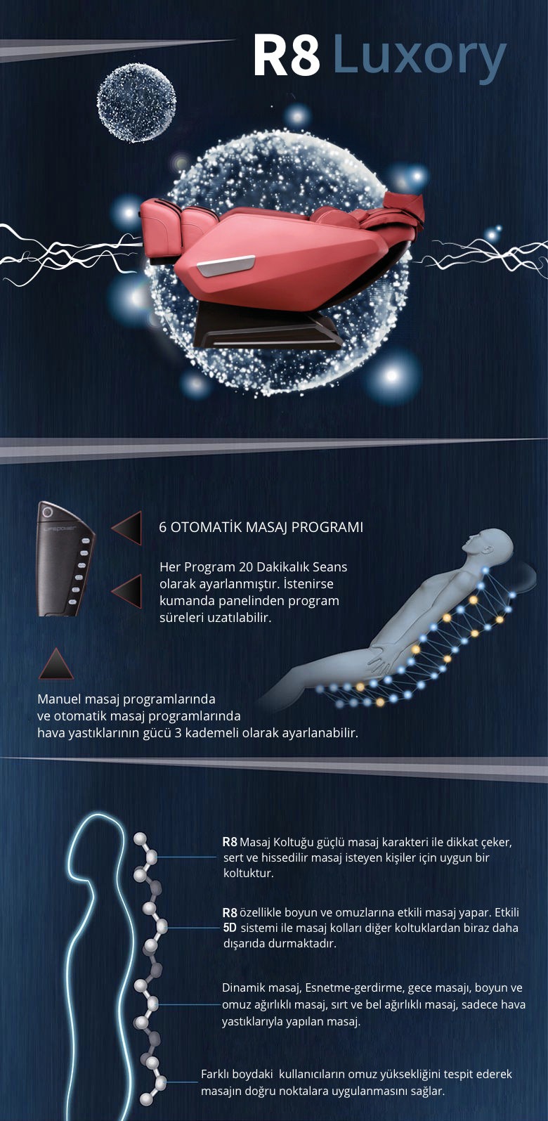 R8 Masaj Koltuğu güçlü masaj karakteri ile dikkat çeker. Sert ve hissedilir masaj isteyen kişiler için uygun bir koltuktur. R8 özellikle boyun ve omuzlarına etkili masaj yapar.