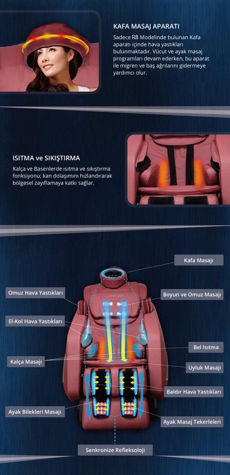 Kafa masaj aparatı R8 modelinin en önemli özelliklerindendir. Kafa masaj aparatı başa takılır ve hava yastıkları başın etrafına ve ense köküne baskı yapar. Migren ağrısı ve baş ağrısı çeken kişiler için cazip bir aparattır.