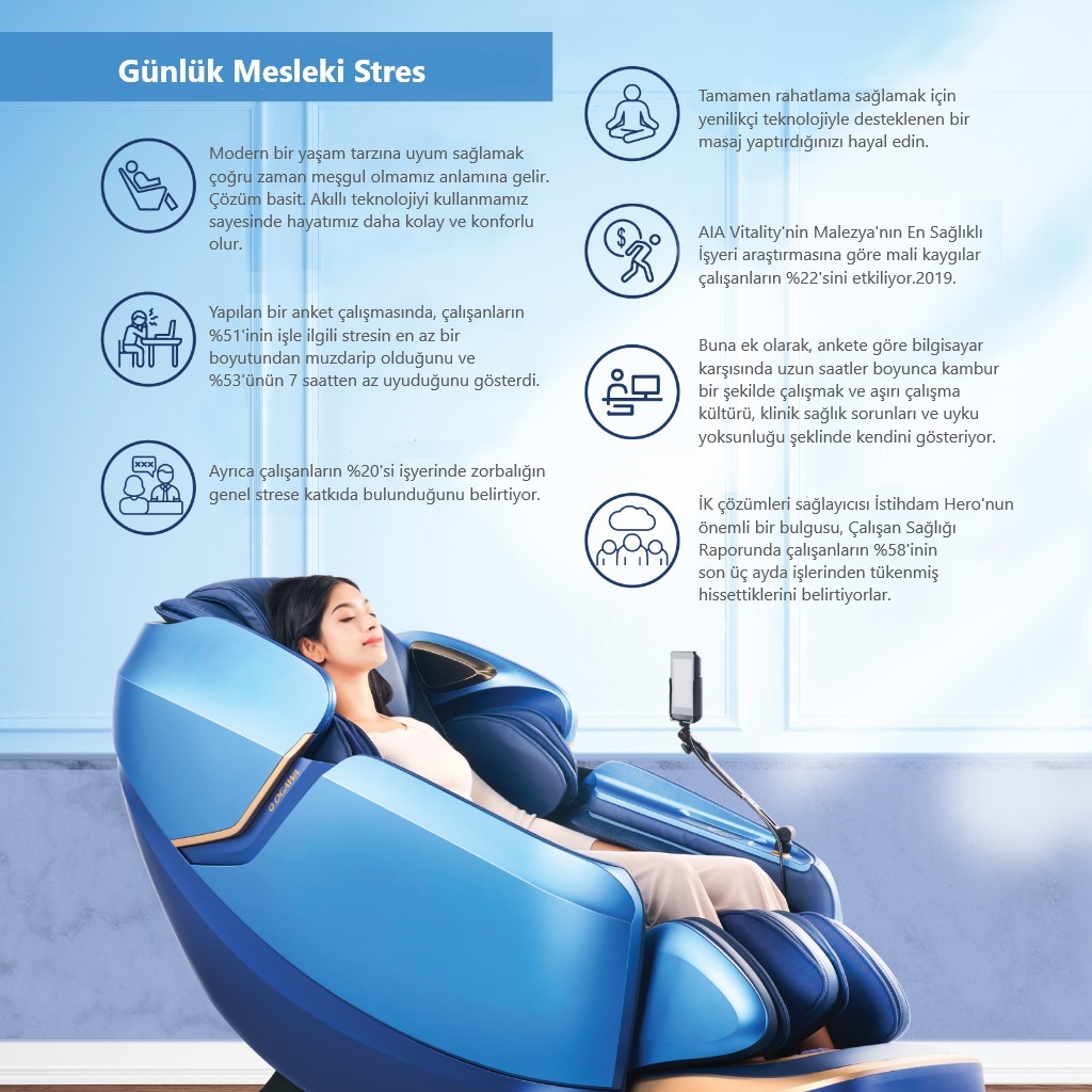 28 yıllık tecrübesi ile dizayn ve teknoloji olarak dünyanın en beğenilen masaj koltuklarına sahiptir. Model çeşitliliği renk alternatifi ve güçlü stoku sayesinde başta Avrupa ve Ortadoğu olmak üzere dünyanın birçok ülkesine ihracat yapmaktadır. Hizmet kalitesini korumak amacı ile sadece kendi mağazalarında müşterilerine ulaşmakta olup Türkiye çapında servis hizmeti vermektedir.